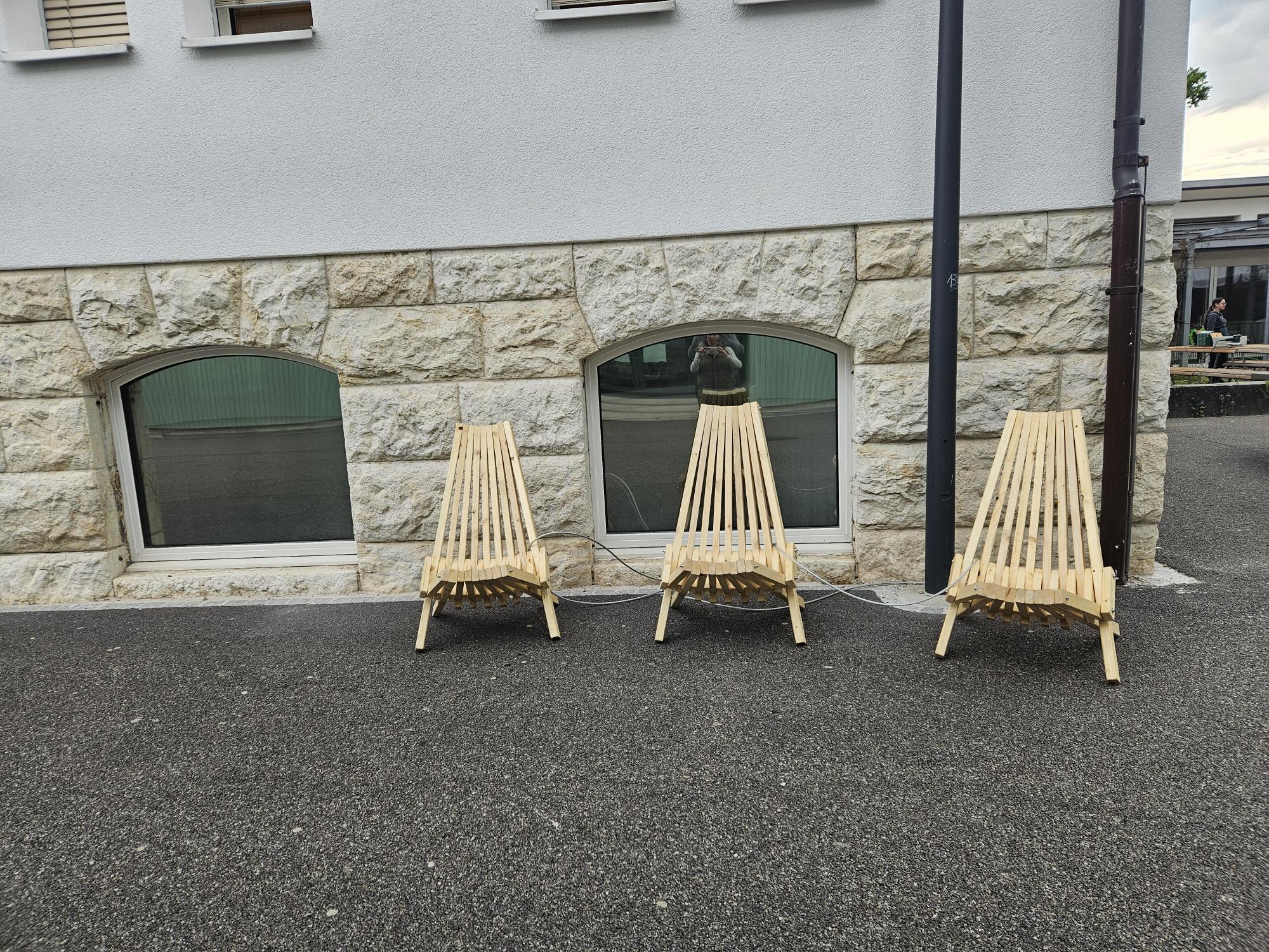 Wir wünschten uns mehr Sitzgelegenheiten auf dem Pausenplatz. Nun wurden fünf Holzstühle mit den PH-Studenten gebaut und auf dem Pausenplatz verteilt.