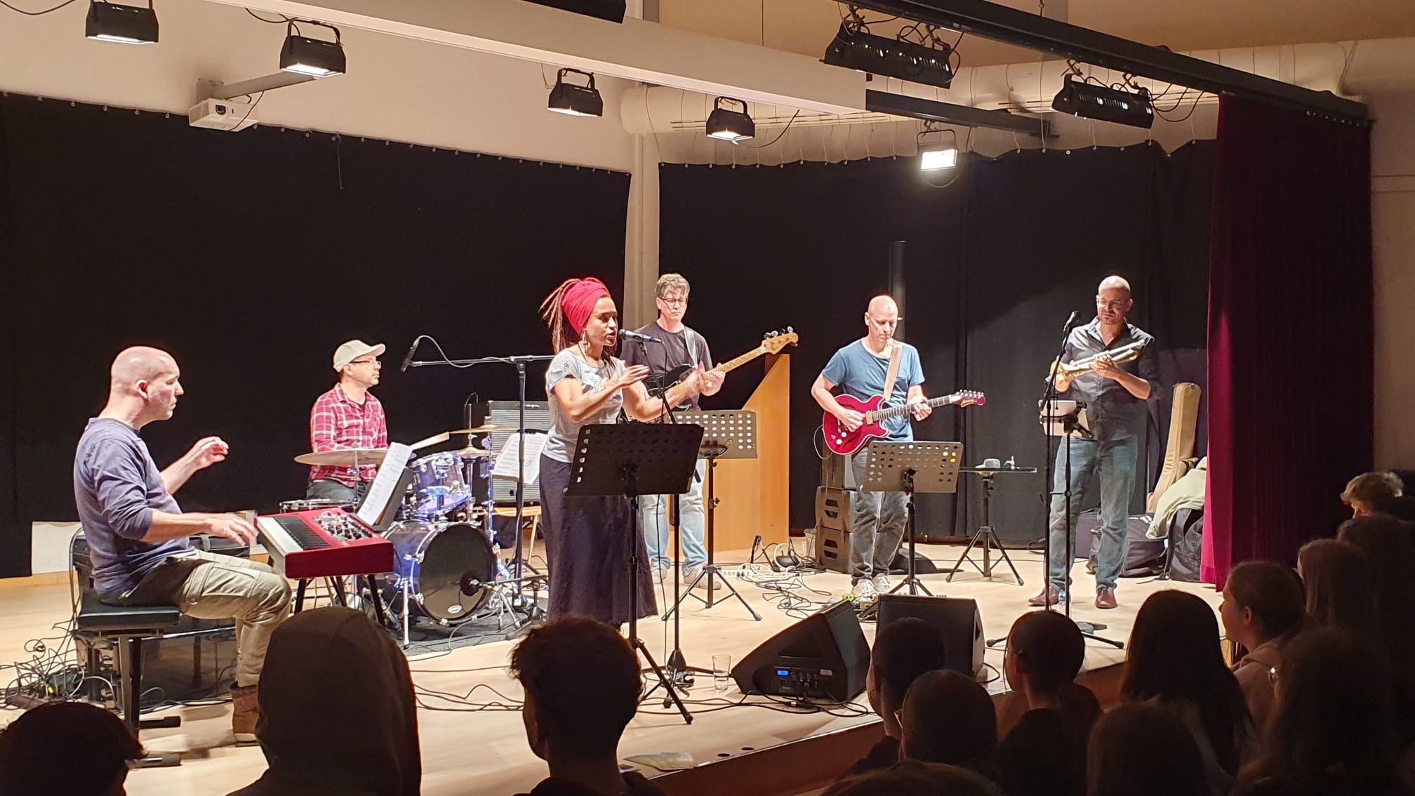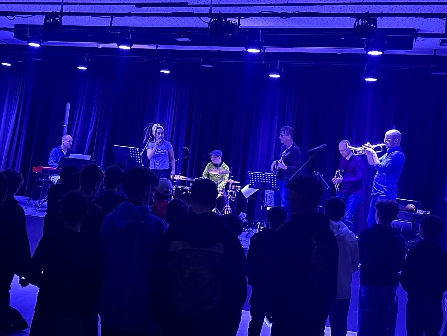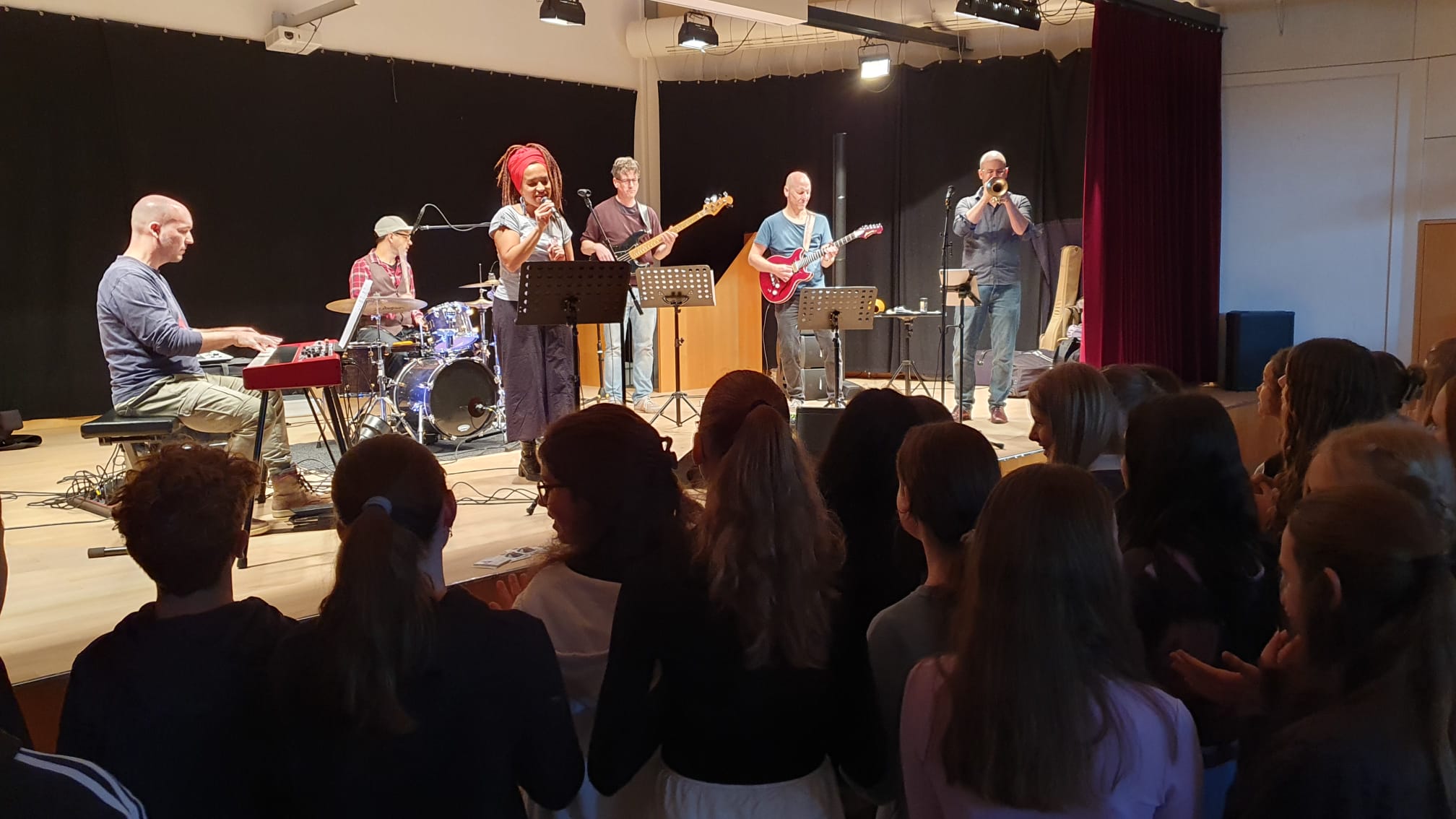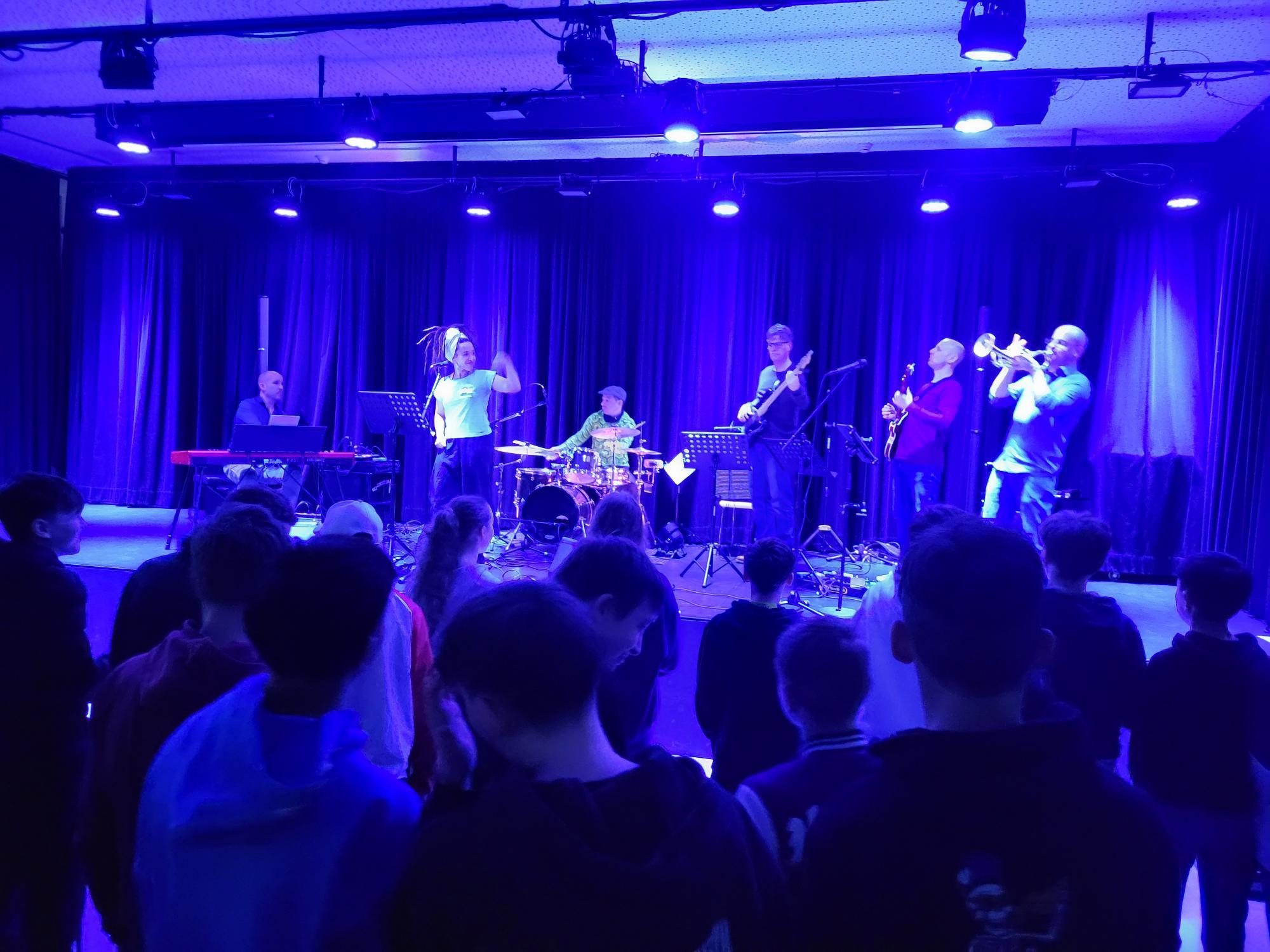 Eine Musiklehrerin und vier Musiklehrer der Sekundarschule Liestal und der Musikschule Liestal boten zum zweiten Mal an der Sekundarschule Liestal im Frenken- und Burgschulhaus vier interaktive Konzerte an, in denen sie die Schülerinnen und Schüler der ersten Klassen auf vielfältige Weise einbezogen. Die Liveband stellte diverse Instrumente wie Gitarre, e-Bass, Trompete, Bluesharp, Piano, Schlagzeug und verschiedene Perkussionsinstrumente in Kombination mit Gesang in abwechslungsreichen Soloparts vor und animierten die Schülerinnen und Schüler mit Bodyperkussion, Call- and Response Gesangsteilen, verschiedenen Tanz- und Bewegungsanimationen und dem Salsa-Grundschritt zum Singen und Tanzen. Miriam Kruger feuerte als Sängerin der Band die Schülerinnen und Schüler an. Jérôme von Allmen überzeugte mit glühenden e-Gitarrensoli, Pascal Ujak groovte mit e-Bass und Michael Wipf begleitete die Darbietung geschmeidig am Schlagzeug. Initiiert wurde das Projekt von Bandleader Christoph Gisin mit Trompete, Bluesharp und Backgroundgesang. Das Programm umfasste eigens für die Band arrangierten Soul-Funk, Latinklassiker und einigen aktuellen Popsongs, welche die Schülerinnen und Schüler zum Mitsingen, Bewegen und Tanzen anregten.